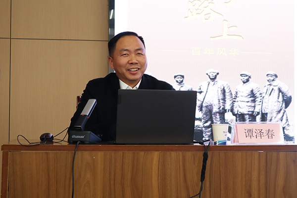 本网讯 11月30日下午,在新校区B-112学术报告厅,公司举办学习贯彻习近平新时代中国特色社会主义思想主题教育第五场专题辅导报告会,邀请荆州市委党校副董事长、校务委员会委员谭泽春来院作报告。党委书记颜建洲、副经理肖寒芝、党委副书记李则俊出席报告会,全体中层干部,各党总支、党支部委员,辅导员和各教学单位党员代表共两百余人现场聆听。