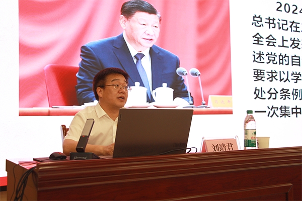 刘靖君以《学习贯彻纪律处分条例 增强遵规守纪高度自觉》为题,从习近平总书记关于开展党纪学习教育的重要论述讲起,系统梳理了《中国共产党纪律处分条例》(以下简称《条例》)的主要特点。他指出,《条例》明确坚持以习近平新时代中国特色社会主义思想为指导,坚决落实习近平总书记关于党的自我革命的重要思想,贯彻党中央关于坚定不移全面从严治党、深入推进新时代党的建设新的伟大工程的部署要求。他重点对《条例》总则主要内容、“六项纪律”的规范性要求作了深入解读,并列举了大量案例,数据翔实,发人深省,为党员、干部深学细悟、学懂弄通《条例》提供了重要指导。