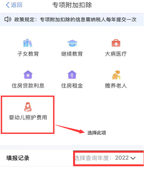 3.选择婴幼儿护理专项附加扣税,所属年份选择2022年