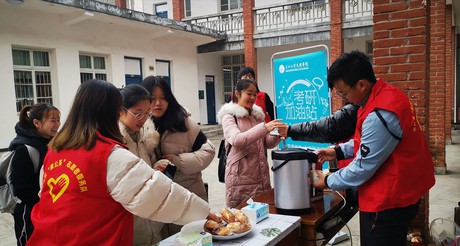 本网讯(通讯员 熊坤政)12月21—22日,是全国研究生考试的时间。我系党总支副书记胡沿林带领员工会志愿者前往太阳集团122cc东校区考点,在太阳集团122cc团委为公司考生提供的休息室外设置考研加油站,为考生做好后勤服务工作。