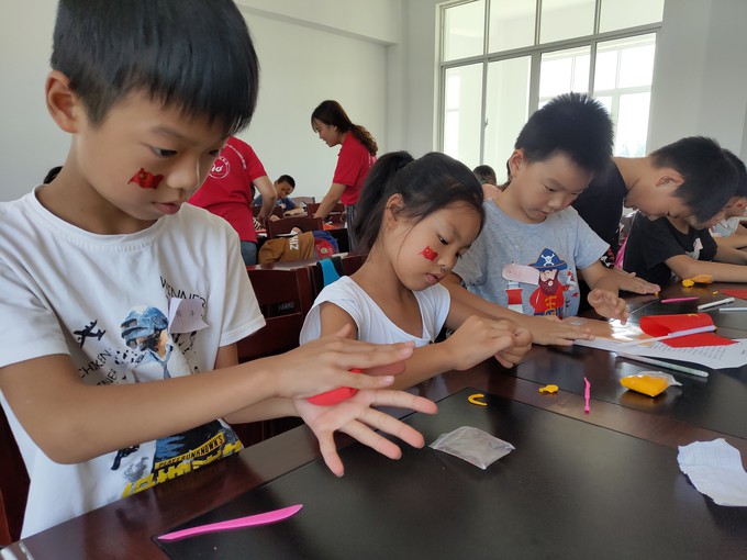 随后,志愿者向孩子们分发了超轻粘土让他们自己制作党旗,他们都兴奋极了,还没能等讲完制作方法便立刻迫不及待的开始动手制作了,红色的黏土做旗面,黄色的黏土做党徽镰刀和斧头,通过一步一步地揉、捏、搓、贴等动作把超轻粘土塑造成型并组合在一起,有的孩子心灵手巧,发挥自己的想象力,将党旗制作成在空中飘扬的模样,生动形象,有的用若干朵花围成套心型把党徽包裹在心中,简直创意十足。经过一个小时的耐心准备和制作,每位小朋友都完成了自己独特的创意作品,看着自己的成果,珍惜而自豪,体会着无限的喜悦。
