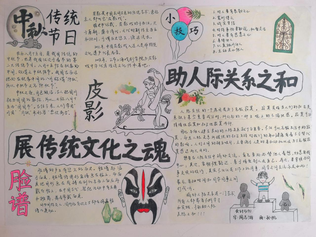 各班级同学踊跃参与,积极收集素材,围绕主题进行手抄报制作,使人际关系理念深入每一个老员工心里此次活动共收到作品40余份,简单的一张白纸,随着创作成员的你一笔我一画、你一言我一语,不断丰富多彩起来。在同学们的作品中,既看到了同学们无限的创造力和认真参与的态度,也看到了我系员工阳光、开放、充满活力的心态。