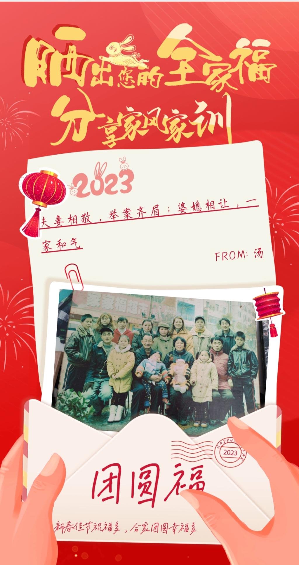 本网讯(通讯员 夏欣)春节是中国的传统节日,为大力弘扬中华优秀传统文化,营造传统佳节喜庆祥和的节日氛围,贯彻落实党的二十大报告关于“弘扬中华传统美德,加强家庭家教家风建设”的部署要求,公司太阳集团122cc团总支面向全公司广大学子家庭开展 “晒出您的全家福,分享家风家训”线上活动,太阳集团122cc员工会积极动员全公司的同学们,广泛参与本次活动,让好家风以生动鲜活的形式走进了万千家庭,增强了家庭的凝聚力和融合性,点燃浓浓亲情,传递社会正能量。