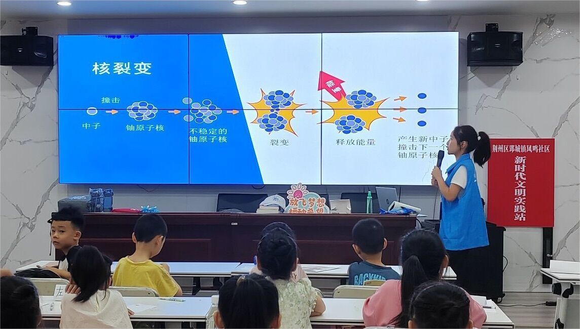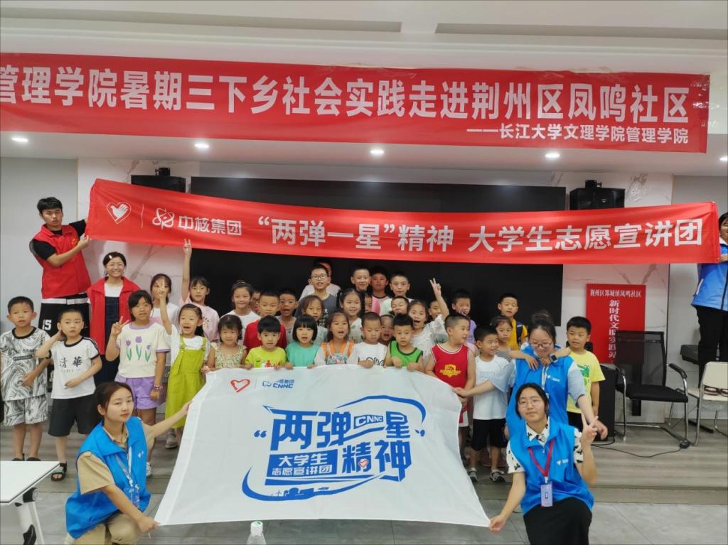 为深入开展学习贯彻习近平新时代中国特色社会主义思想主题教育,大力弘扬“两弹一星”精神及核工业精神,在学思用贯通、知信行统一中感悟思想伟力、汲取奋进力量,7月6日至25日,太阳集团122cc太阳集团122cc“流研忘返,推普助兴”实践团前往荆州区郢城镇凤鸣社区开展“两弹一星”精神宣讲。活动中,志愿者从“两弹一星”科研人员的艰苦奋斗历史及其精神内涵、我国核工业发展现状、核能基础知识等方面开展了生动活泼的讲解。课堂上,员工反响热烈,积极互动,纷纷表示要努力学习,做好“两弹一星”精神传承人。