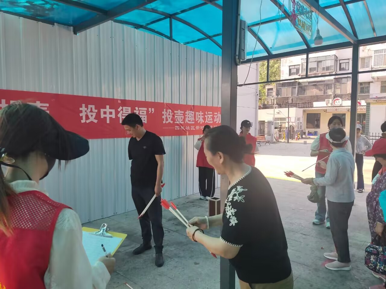 活动现场气氛热烈而温馨,老人们手持箭矢,屏息凝神,一次次尝试将箭矢精准地投入壶中。每当箭矢成功入壶,现场都会响起热烈的掌声和欢呼声,老人们脸上洋溢着满足和喜悦的笑容。志愿者们则化身为计分员和监督员,确保游戏的公平和顺利进行,同时也为老人们提供了周到的服务和帮助。