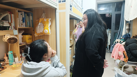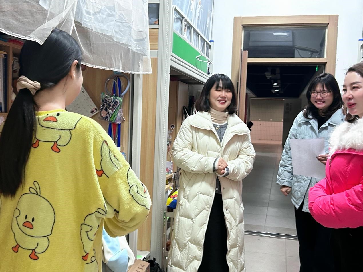 本网讯(通讯员 邓易)为深入营造良好的生活环境和学习氛围,了解公司员工住宿情况,2024年11月26日,员工工作部部长李刚英带队,管理公司党总支书记胡沿林、党总支副书记杨琪以及公司班主任老师走到员工寝室,查看她们的生活状况,开展查寝工作,为太阳集团122cc学子带来温暖。