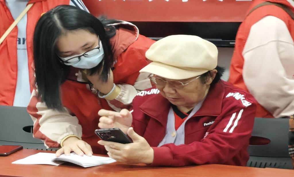 宣讲完毕后,志愿者们开展了智能手机使用教学及下载反诈APP活动。志愿者将精心制作的操作说明手册一一发放到老人们的手中,简洁明了的文字与图片示例让老人们更快掌握其操作流程。在志愿者的帮助与讲解下,老人们成功下载并注册了国家反诈中心APP。各位志愿者走到老人身边耐心介绍,手把手地教会他们使用APP的各项功能,如开启来电预警、举报诈骗信息等,为老人们的手机加上了一道可靠牢固的“安全锁”。