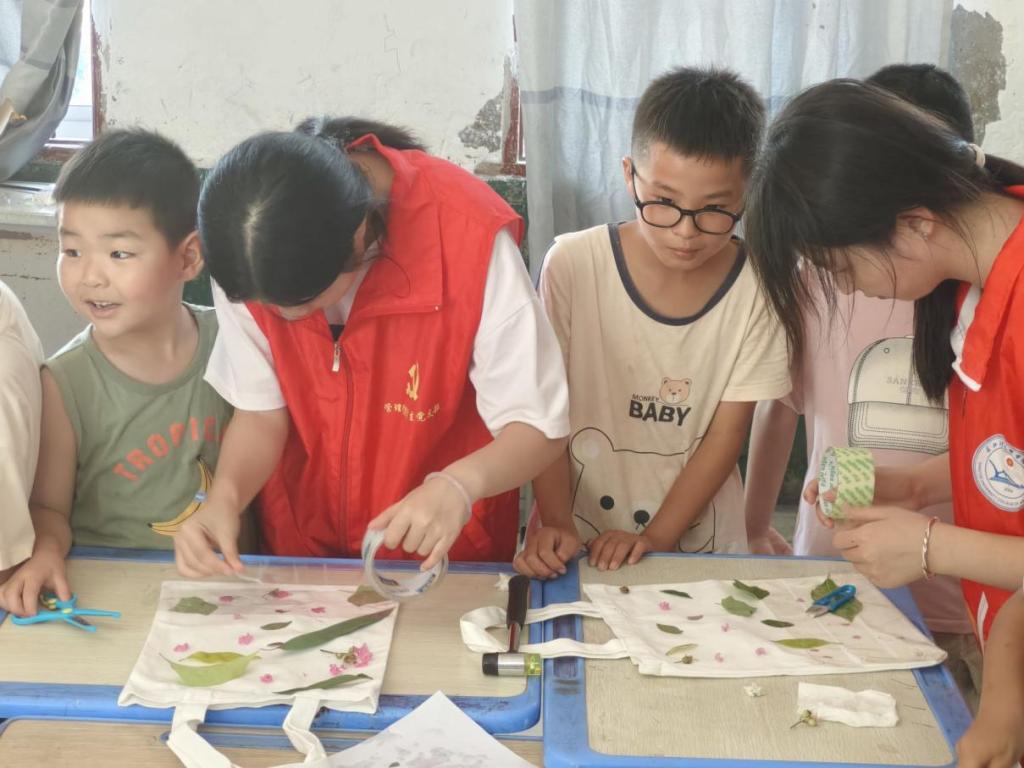 艺术是滋养心灵的雨露。志愿者们为孩子们打造了充满自然意趣的艺术课堂:树叶拼贴画活动中,孩子们收集各种形状的树叶,发挥想象力组合成小动物、风景画等作品,童真创意跃然纸上;植物拓印环节,孩子们将新鲜叶片固定在帆布包上,用工具轻轻敲打,让叶片的纹理与色彩自然晕染,制成独一无二的天然艺术品。动手创作的过程中,孩子们不仅感受着自然之美与艺术之趣,更在剪裁、拼贴、拓印的操作中提升了审美能力与动手协调能力。课堂上的欢声笑语与专注神情,成为夏日乡间最动人的画面。