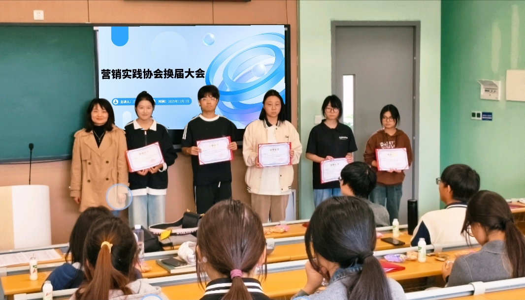 本次大会由汪雪菲同学主持,大会在她热情洋溢的宣告声中拉开帷幕。首先,2024届会长秦恬茨和副会长李存鑫代表上一届干部成员做任期工作总结报告。她们深情回顾了过去一年中,协会在活动建设、专业实践拓展及会员能力提升等方面取得的丰硕成果,并分享了在协会工作中的成长与感悟,希望新一届干部成员能够继往开来,再创辉煌。接着,主持宣读了关于2025届干部成员决定。在全体成员的见证下,指导老师刘春梅老师为新任会长汪丞宣、副会长肖燕及其他新任部长颁发任命通知书,各新当部长上台发表任职报告。新任会长与副会长发言,号召全体新成员以饱满的热情和务实的态度,共同将营销实践协会建设成为一个更具活力、更有价值的学习与实践平台。