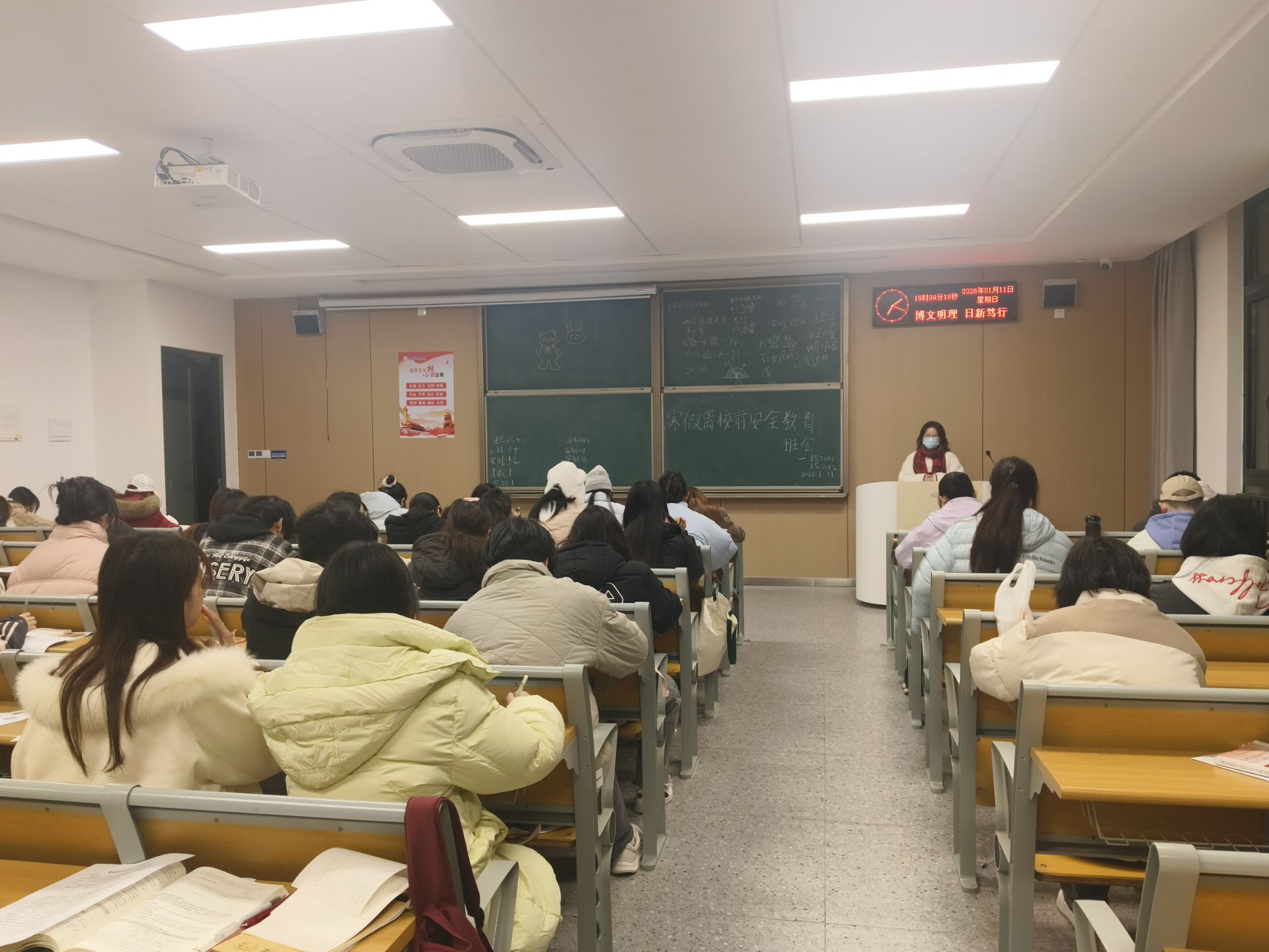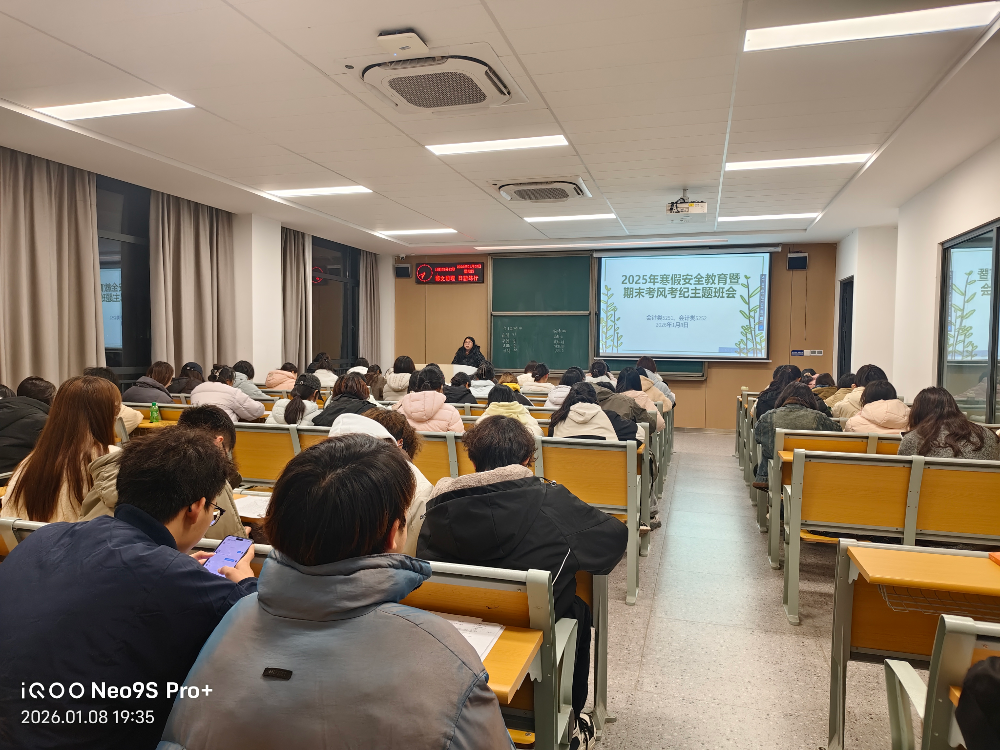 在各班班会上,辅导员老师们首先向同学们传达了公司关于寒假放假及春季学期开学的具体安排。随后,班会围绕“安全离校,平安度假”这一核心主题,展开了系统、细致的教育引导。