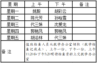 5.系部领导听课安排:陈元芳主任在星期一第一小节听韩慧芳老师的《管理心理学》和星期二第二大节听陈丽老师的《报关实务》;姚毅副主任在星期四第一大节听陈芳老师的《证券投资学》。
