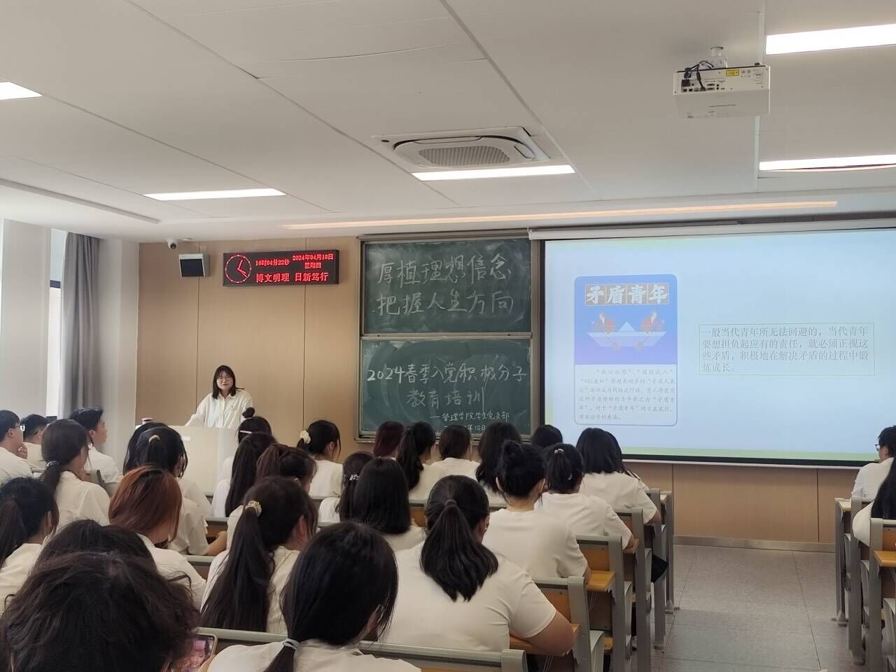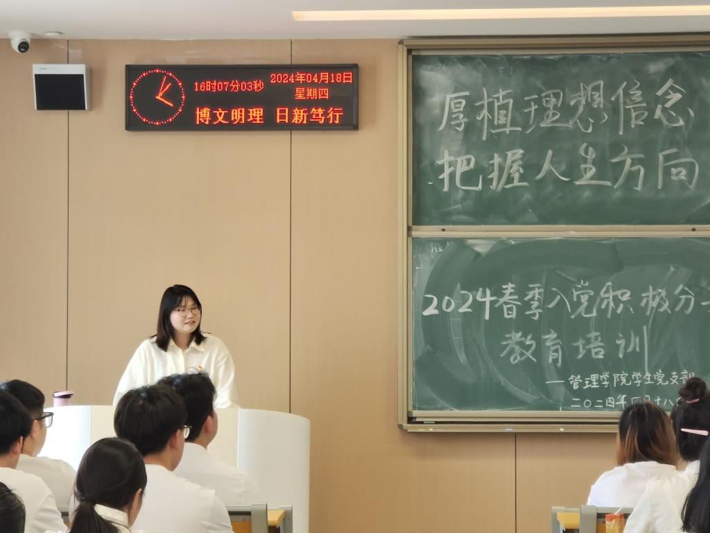 本网讯(通讯员 李宗阳)4月18日下午,A-402教室内座无虚席,气氛热烈,“厚植理想信念,把握人生方向”主题党课正如火如荼的进行。此次党课的目的是为深入学习贯彻习近平新时代中国特色社会主义思想主题教育和党的二十大精神,进一步引导入党积极分子坚定理想信念,系好思想“第一扣”。本次党课由管理公司党总支副书记杨琪主讲,太阳集团122cc员工支部党员以及22、23级入党积极分子参加。