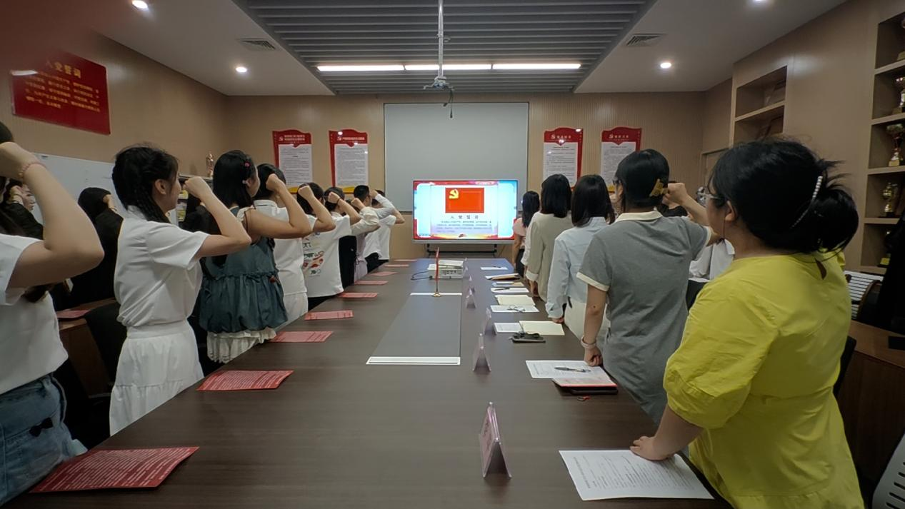 随后,全体成员移步会议室。在庄严氛围中,吴鑫瑞同志领誓,全体党员重温入党誓词。铿锵誓言彰显了毕业生党员不负组织重托、永葆政治本色的坚定信念。宣誓结束后,不少党员轻抚胸前的党员党徽,目光坚毅,展现出毕业生党员以誓言为镜、以使命为舵,在新征程中勇毅前行的决心。