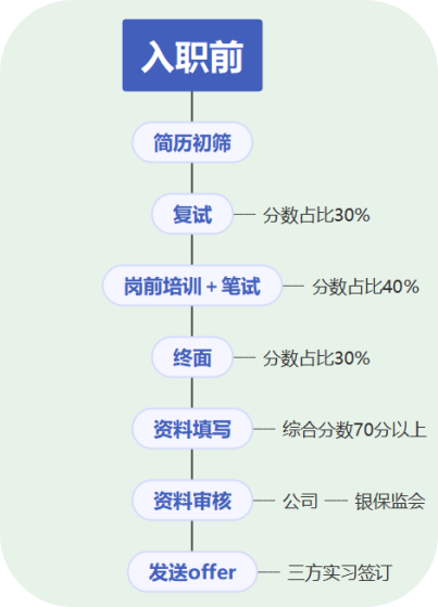 应聘流程:简历投递筛选→复试→岗前培训+笔试→终面→录用→进阶培训