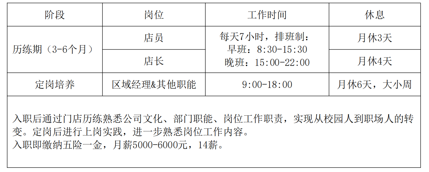 培养方向:定向培训,储备期结束后,根据个人意愿结合公司需求,在区域运营管理、开发选址、市场策划、商品管理、人事管理等模块中确定培养方向。