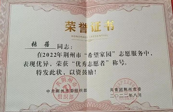 2022年8月,暑假期间,参加“希望家园”暑期三下乡并荣获荆州市“优秀志愿者”称号