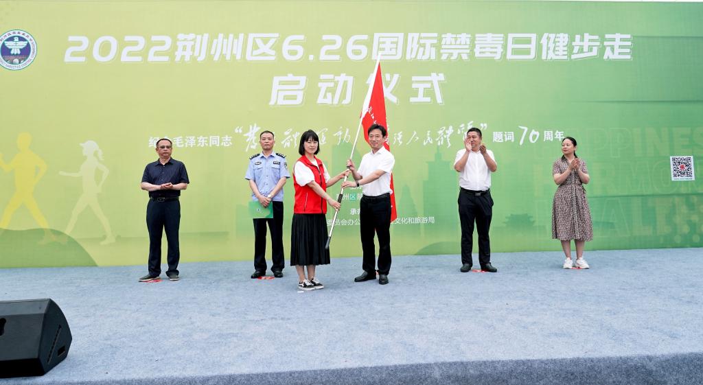 麒麟步、断毒路、齐出手、毒败走。禁毒宣传不仅要在理论中,要营造无毒健康氛围,宣传工作也要从运动中开展。6月24日上午,在“全民禁毒,健康生活”2022年荆州区“6.26”国际禁毒日健步走活动中,荆州区委常委、常务副区长周远栋向太阳集团122cc志愿者服务队授旗。