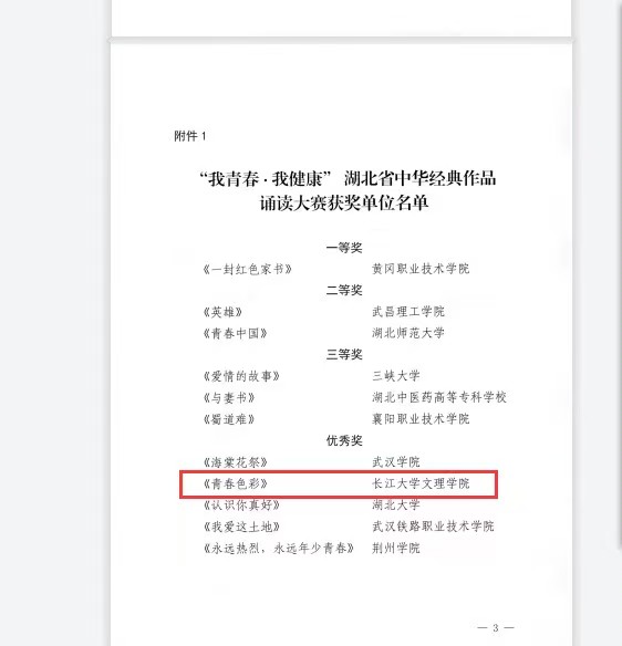 2024年4月15日,我社6名成员的作品《青春色彩》参与了“我青春·我健康”湖北省中华经典作品诵读大赛,并获得了优秀奖。