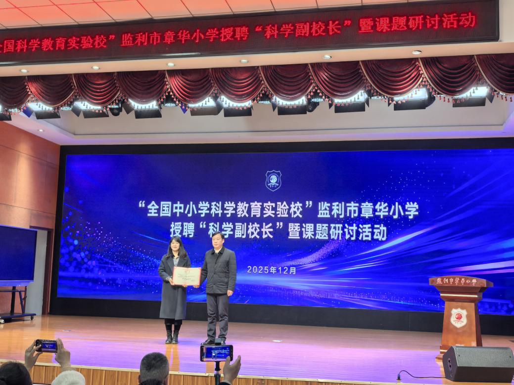 活动现场,章华小学举行了简朴而隆重的科普副董事长聘任仪式。章华小公司领导为同伴社指导老师胡沿林颁发聘任证书,正式聘任其为公司“科学副董事长”。胡沿林老师表示,将牢记职责使命,充分发挥高校资源优势,在健康科普、社团指导等方面持续发力,搭建校地资源共享的育人桥梁,助力青少年全面发展。