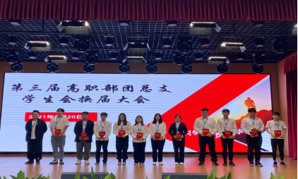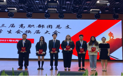 大会第三项;书记为第三届高职部团总支员工会主席团及部长颁发纪念品,之后进行部门交接仪式,第三届各位部长为第四届届各位部长佩戴工作牌。