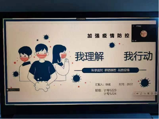 班会内容分为理性认知,科学防护,勇担责任,处分暂规四个板块,着重强调了当前疫情防控正处于关键时期,请同学们要继续保持警惕,非必要不出校,在校园内要佩戴口罩出行。各班班长以“面对疫情同学们应该怎么做”为话题展开了讨论,同时就个人卫生、作息时间等方面做了以下要求:在保证自身安全的前提下,不耽误学业,按时上下课,遵守防疫政策,服从公司安排。同学们纷纷表示,会积极配合公司采取的封闭式管理,做好个人防护,与公司一起面对这场没有硝烟的战争,为自己提供健康安全的学习及生活区域。