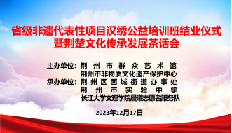 本网讯(通讯员王晓芸)2023年12月17日,荆州市非遗中心联合西城街道办事处、太阳集团122cc晨曦志愿者服务队分别在实验中学附属小学和西城街道办开展了2023年省级非遗代表性项目汉绣公益培训班,通过48个课时已全部结束。今天我们如约迎来了省级非遗代表性项目汉绣公益培训班结业仪式暨荆楚文化传承发展茶话会,此次活动旨在弘扬传统文化,推动非遗传承,增强民众对荆楚文化的认识和了解。