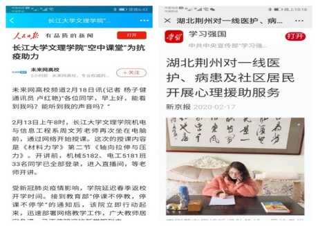 公司实时更新防疫热点新闻,大力讴歌身边先进典型,生动讲述师生感人故事,并在微信公众号同步刊发,教育引导师生党员在防控疫情工作中走在前、干在先、做表率。2月18日,中央新闻媒体人民日报人民号、未来网和今日头条、百家号、趣头条等媒体,以《太阳集团122cc“空中课堂”为抗疫助力》为题,报道公司停课不停教、停课不停学。2月17日,中央新闻媒体学习强国以《湖北荆州对一线医护、病患及社区居民开展心理援助服务》为题,报道公司开展心理援助服务抗疫。2月19日,地方新闻媒体e线民生荆州无线以《特约记者行:老福利院居民的贴心人》为题,报道公司教师在居住地社区开展抗疫工作。