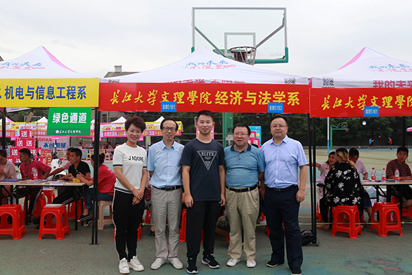 秋风习习,秋雨潇潇,又是一年迎新季。今天(9月7日)下午,在西校区经济与法学系迎新点,老师们接待了一个“特别”的新生家庭。这一家人与系主任万楚军交谈得格外亲切,人群中不时传出一阵阵爽朗的笑声。经济与法学系党总支书记李成军也在现场接待。