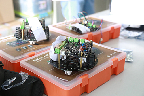 赛场上,选手们聚精会神紧盯电脑屏幕,手中不停组装机器人套件,认真思索,沉着答题。机房里异常安静,只听得见手指轻敲键盘和小组成员小声讨论的声音。 有一组同学正在现场制作“走正方形的机器小车”。他们利用所学物理知识,沉着冷静、耐心细致地协调配合,经过十几次的数据输入和结果测试,最终在既定时间内出色完成任务。