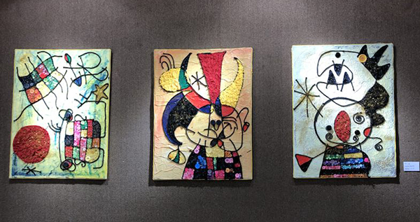 郭睦庚(右一)、张系斌(左一)、柯昌龙(右二)驻足欣赏作品