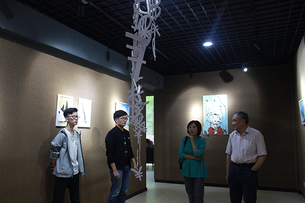 当天下午,展厅里人潮涌动。同学们带着欣赏与好奇的心情,步入璀璨的艺术殿堂,徜徉在富有想象力的艺术空间,聆听创作者现场分享他们的创作历程和创作灵感,在江丽和乐希两位指导老师的现场点评中,品味作品的设计思想、设计过程和创作方法,从中吸取有益经验。