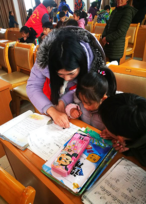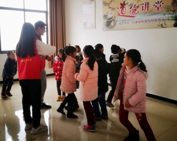 在皇陵村村委会会议室,志愿者结合专业所学,分小组为留守儿童辅导功课,与孩子们亲切交流沟通,开展诗歌朗诵、基础绘画、手工折纸等特色课程和活动,鼓励他们克服困难,好好学习,将来以优异成绩回报父母和社会。