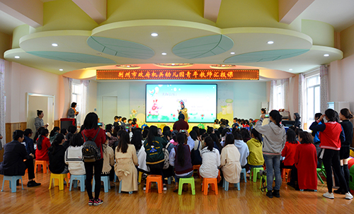 在户外活动区和多功能活动室,同学们认真观摩了幼儿园青年教师在健康领域的体育活动、艺术领域的音乐活动汇报课。参加教学展示的两位教师为孩子们创设了梦幻的情景、宽松和谐的氛围,孩子们思维活跃、兴趣高涨,在游戏中主动接受知识。