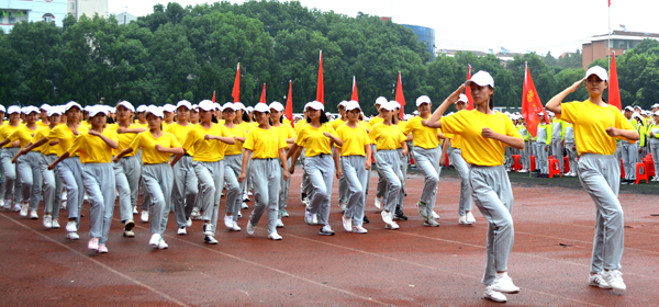 阅兵式上, 10个新生军训方队迈着整齐划一的步伐依次通过主席台,他们步伐坚定、队形整齐、口号嘹亮,自信昂扬,展现着十余天的训练成果。