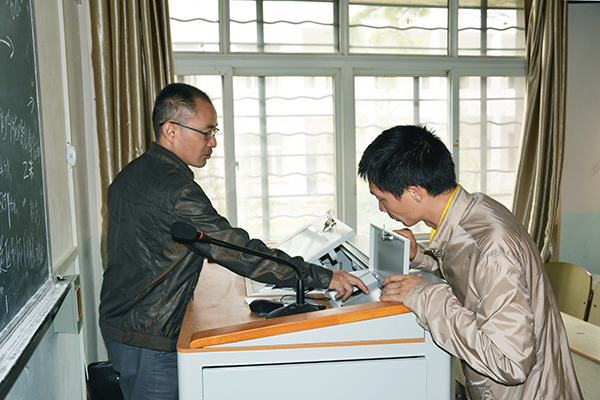会后,李锐、官彬对公司2017年新建的10间多媒体教室逐一进行检查,认真查看了教室内设施、设备的运行情况。通过检查,各多媒体教室状况良好,设备均可正常使用,为新学期教学活动顺利开展提供有力保障。