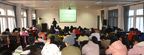 刘汉民从美学的角度,见解独到的解析了毛泽东诗词《忆秦娥•娄关山》中的“山精神”, 指出毛泽东用古典的手法写山,将“山”精神化与人格化,是毛泽东的美学创造;深刻分析了《七律长征》的创作特色,认为“万水千山只等闲”中的“等闲”二字是一种性格、一种情态,表现了红军的乐观情怀与胆量,指出下句的“暖”和“寒”二字并非感觉,而是颜色的冷暖,运用了通感的修辞手法。他认为,毛泽东诗词的字里行间透着无穷的韵味,其美学创造是后无来者的,同学们应透过诗词,深刻领会内涵精神,继承和弘扬革命精神。