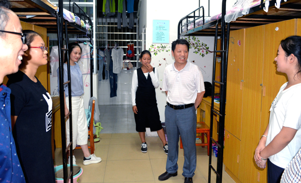 “你们来自哪里?”、“选了什么专业?“对公司感觉怎么样?”王金琼来到西校区1、2、4、12栋员工宿舍,详细询问新生对新环境的适应情况,了解同学们对公司的印象和感受。在12舍110室,王金琼与国贸5161班新生王劭卿亲切交谈,鼓励她尽快适应新环境,希望同学们注意人身和财产安全,团结友爱、互帮互助,努力学习,营造和谐的寝室氛围;在2舍410室,看望环境设计专业的新生,叮嘱他们如果有困难一定要向老师和领导反映,公司会帮助大家解决困难,并希望他们能尽快制定个人发展规划,利用好大学的平台锻炼自己的能力,夯实专业基础,提高综合素质,顺利完成学业。