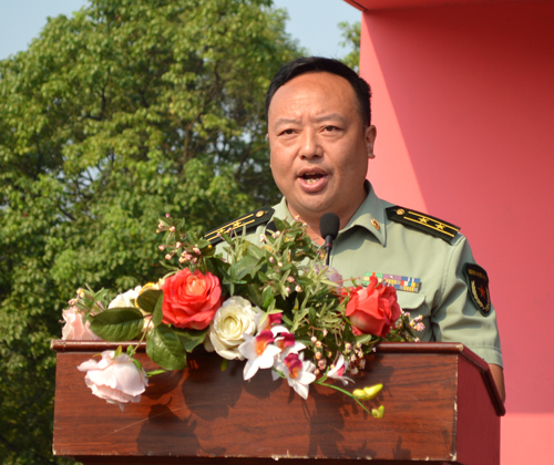 王金琼代表公司向荆州军分区教导大队赠送匾额,全体起立鼓掌欢送教官。