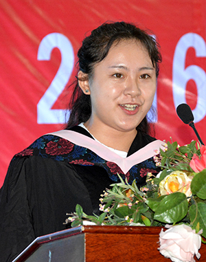梅平以《超越梦想 不负此生》为题在毕业典礼上发表讲话,教师代表周文芳以《昂首踏上梦想舞台》为题,向毕业生送上祝福、勉励和希望,毕业生代表徐梦伊以《让我们共同相约》为题,代表2016届毕业生表达对母校、师长、父母和亲友同窗的感谢。