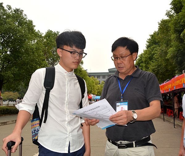 在建筑与设计系迎新点,梅平与前来报到的大一新生郭欣进行亲切交谈,仔细了解其就读专业以及对未来人生的规划,鼓励她在四年的学习时光努力追逐自己的梦想。