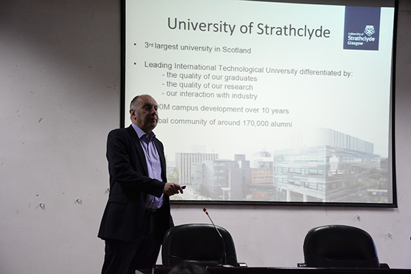 会后,道格拉斯·布罗迪在学术报告厅为公司人文与传媒系、外国语系相关专业学子,作出国留学报告,介绍了思克莱德大学的历史沿革、专业设置、留学费用、留学条件,以及合作公司员工前往攻读学位的优惠政策等。