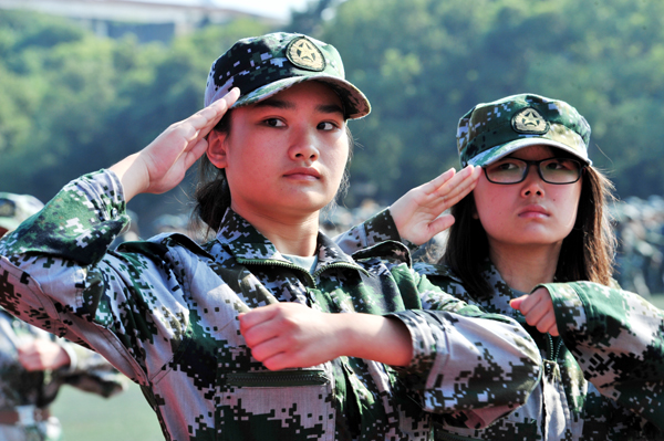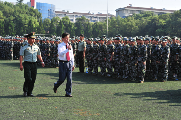 经理王金琼(右)检阅新生军训方阵