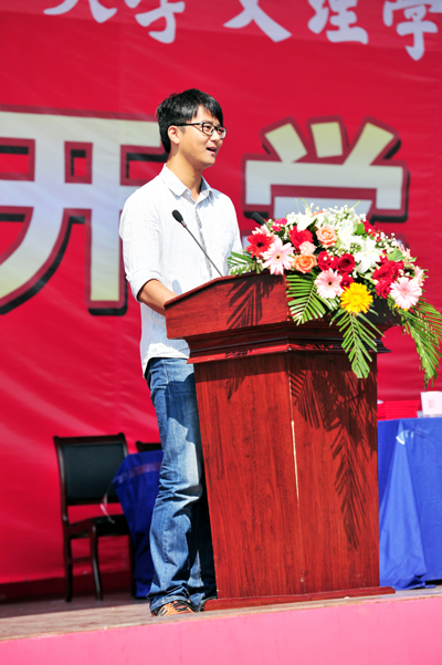 教师代表人文系甘泉老师将自己的教学感受分享给新生,指导新生做好个人规划。他指出,端正的学习态度是首要的,其次就是宽容、沟通和交流。“年轻时的喜乐苦寂都是修行”甘泉说道,“只要我们每一天都认真地对待自己的生活、学习,那么四年后必将无愧于你的内心。”