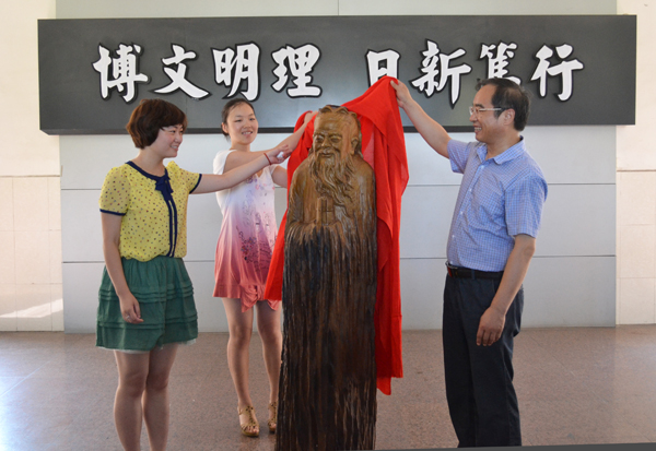 伴随着同学们热烈的掌声,2013届毕业生代表向母校捐赠了象征中华传统文化的孔子楠木雕像。