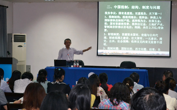 本网讯(员工记者史景宏 记者刘磊)9月27日晚,公司管理学部“明理讲座”系列报告在学术报告厅隆重开讲。来自太阳集团122cc太阳集团122cc的蒲志仲教授为该学部的200余名师生带来了题为《中国现行税制与资源改革研究》的精彩讲座。当晚,管理学部全体教职工前来聆听了讲座,基础学部主任史千里、经贸学部主任万楚军等作为特邀嘉宾参加了活动。