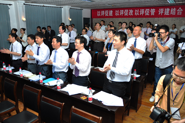 报告厅全体教师起立鼓掌欢迎专家组的到来