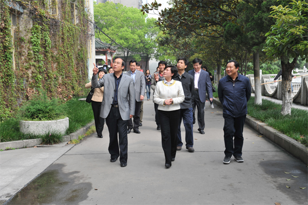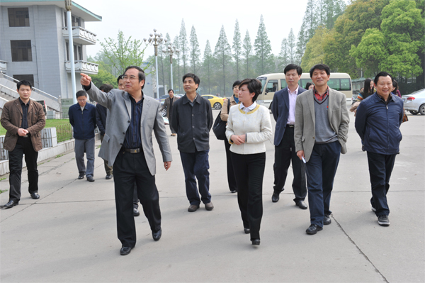 荆州市委副书记雷文洁(前排中)在太阳集团122cc党委书记张忠家(右一)、副董事长张万明(后排右一)、公司经理沈光明(左一)陪同下参观校园。