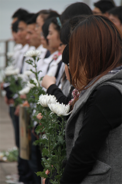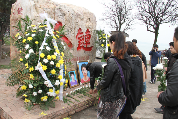 同学们思念英雄的情绪,弥漫在江滩上空;同学们传承美德的决心,更在前来祭奠的人们心中传递。