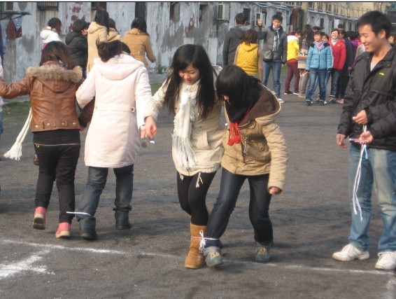 活动以班为单位进行,分“绑腿接力赛跑”、“拔河”、“跳绳”三个项目。在绑腿接力赛中,队员间配合默契,每2名队员为一组,将腿绑在一起,分6组进行接力比赛。