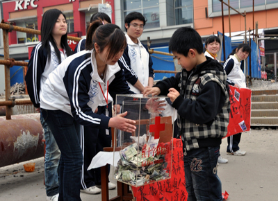 “青海玉树发生7.1级地震,请大家献点爱心吧。”每当有人群经过,募捐点的同学们便齐声说道。募捐点前的宣传板上一张张地震灾区悲戚的图片吸引着来往的路人,许多人站在宣传板前久久不愿离去,一位大约五六岁的小女孩从家长手中接过零花钱,以一种虔诚的样子,带着为灾区人们祈福的表情,将钱小心翼翼地投入捐款箱中。路人们也纷纷捐出爱心款,将10元、50元的爱心款投入捐款箱。